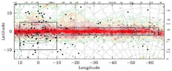 Such as Cepheids, semiregular variables, W UMa-, and δ Sct-type stars. The asymmetric distribution of the known globulars in the Galactic center region hints at the presence of additional, as yet undiscovered objects (Ivanov et al., 2005; Kurtev et al., 2008). Our team members have already carried out successful campaigns searching for new clusters in the 2MASS Point Source Catalogue (Ivanov et al., 2002; Borissova et al., 2003; Dutra et al., 2003). Note that 2MASS, with a Ks, lim = 14.5 mag in the bulge, discovered hundreds of open cluster candidates, as well as two new globular clusters. Because we will reach 3 − 4 mag deeper, we expect to find many new clusters.